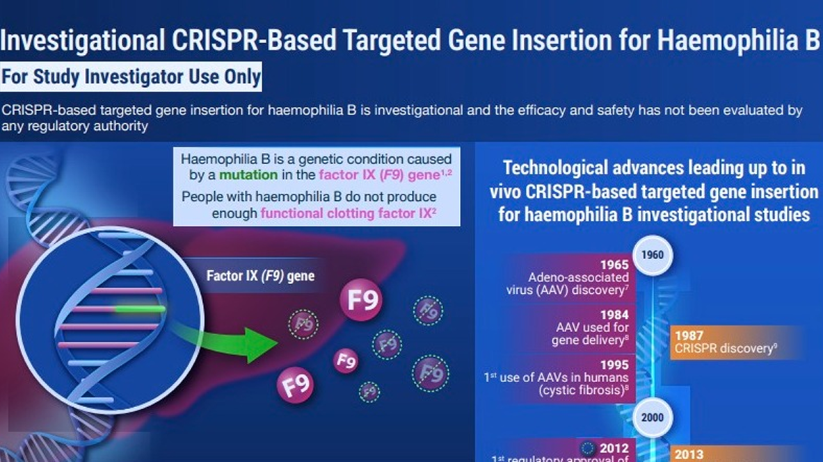 Component 1 contains a promoter-less, F9 DNA gene encoding wild-type human FIX protein, delivered using recombinant adeno-associated virus serotype 8 (rAAV8). The F9 DNA template is inserted at the location where the double-strand DNA break (DSB) has occurred and is transcribed under the influence of the endogenous Albumin (ALB) promoter, resulting in wild-type human FIX protein expression and secretion from the liver.